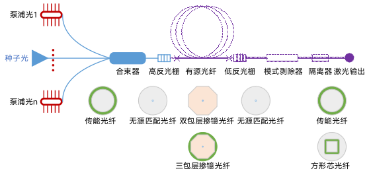 图1典型光纤激光器结构及相关激光光纤示意图