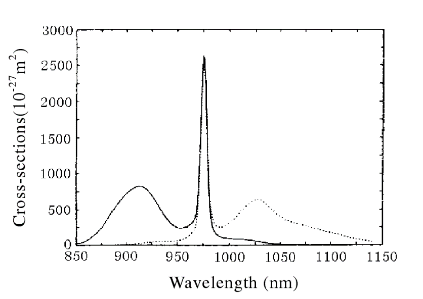 掺镱(Yb3+)光纤激光器以其稳定性高、光束质量好、斜率效率高等优势得到较快发展。掺镱光纤相比于其他稀土离子掺杂光纤具有很多优势,Yb3+离子吸收带如图3所示,在800~1100nm范围内,能与ZnLnAs半导体泵浦源的发射光谱有效的耦合,同时其吸收带较宽,在短波长(小于970nm)的吸收截面变化较为缓慢,这对于输出波长因受到环境温度影响且发射带窄的半导体激光器泵浦非常有利,即无需严格控制环境温度来获得相匹配波长的半导体激光输出。同时Yb3+能级结构较为简单,只包含两个多重态,因此在泵浦波长及信号波长都不存在激发吸收。Yb3+光转化效率很高,有较大的能级间隔,能排除非辐射弛豫及浓度淬灭现象发生。同时Yb3+材料产生的热负荷较低,且荧光寿命长,有利于能量存储。